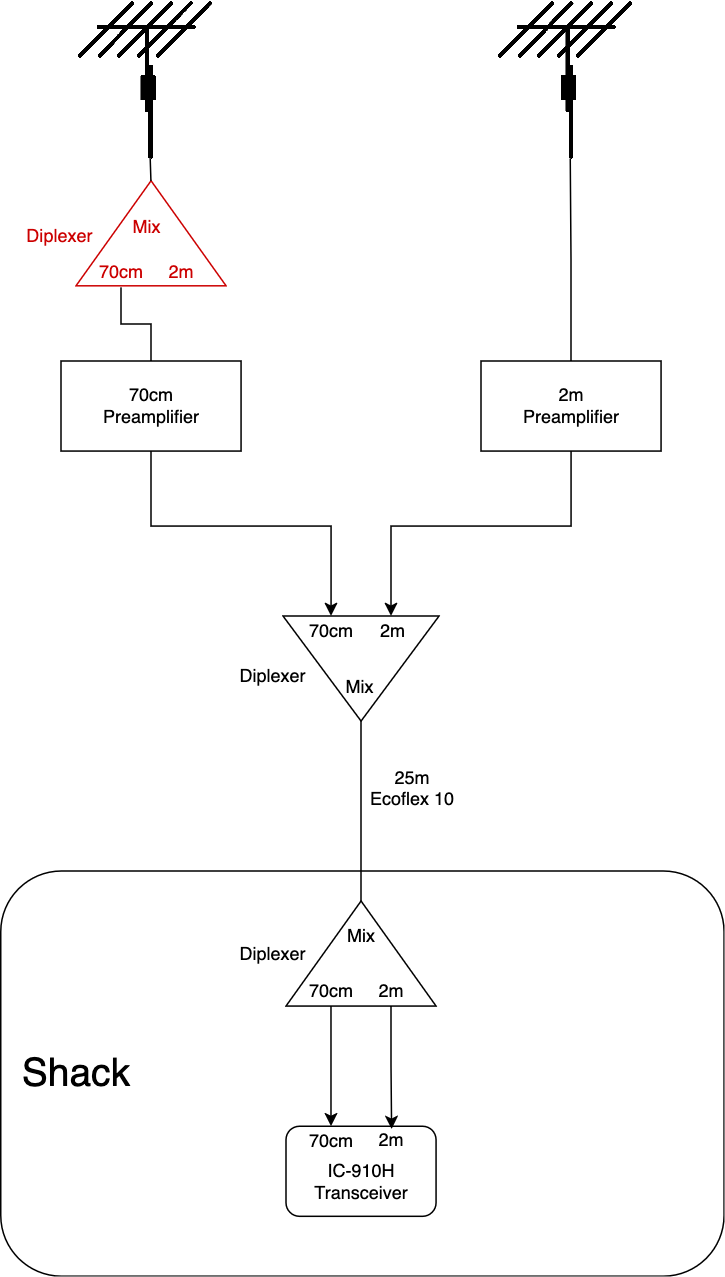 The following diagram shows how the full configuration looks like with the newly added diplexer in red: