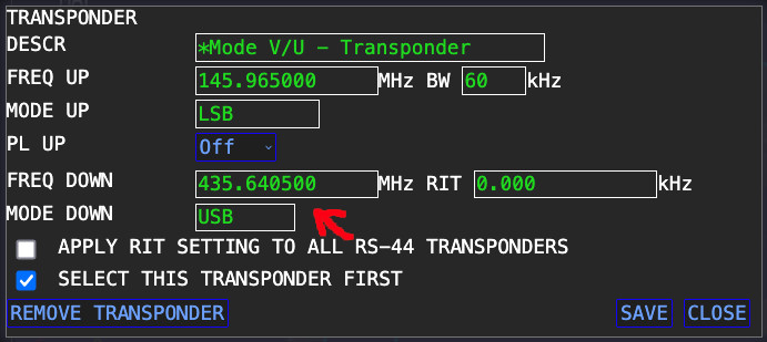 In the following screenshot you can see that I have added 500Hz to the downlink frequency for the SSB transponder of the RS-44: